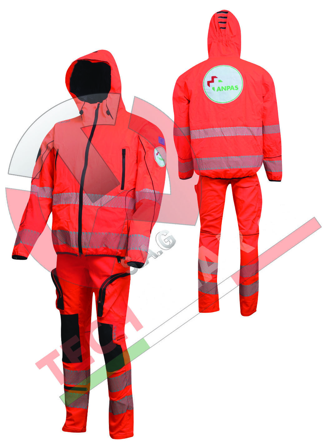 Giubbino con collo alto, maniche a giro staccabili e fondo manica rifinito con elastico. Due tasche a filetto al petto chiuse con cerniera. Tasche inferiori a toppa di forma arrotondata chiuse con cerniera. Elastico pretagliato in vita. Chiusura anteriore tramite cerniera. Logo ANPAS sulla schiena e sulla spalla sinistra.